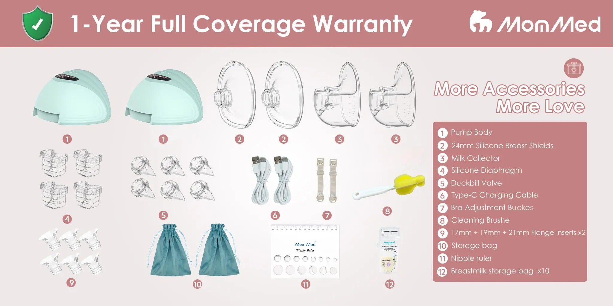 The MomMed S21 breast pump comes with a built-in rechargeable battery that lasts up to 5–6 pumping sessions per full charge. Use the included USB charging cable and allow approximately 2 hours for a full charge. Always charge before first use.