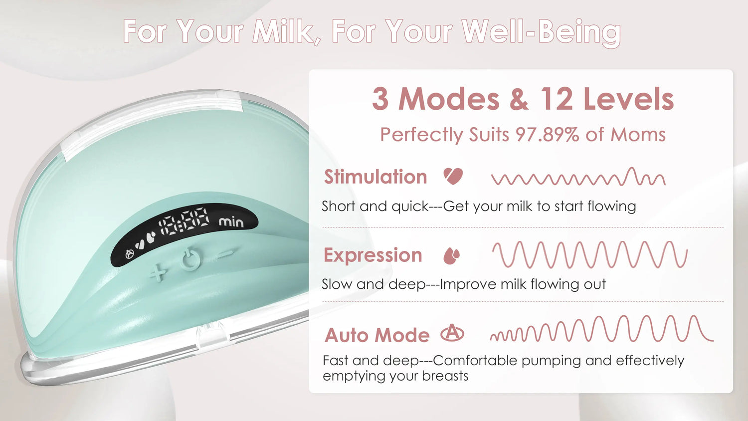 The S21 has 3 modes—Stimulation, Expression, and Auto—each with 12 adjustable levels. Start with Stimulation Mode to stimulate letdown, then switch to Expression Mode to collect milk. The Auto Mode mimics a baby's natural suckling rhythm. Customize the settings to find your ideal comfort and efficiency.