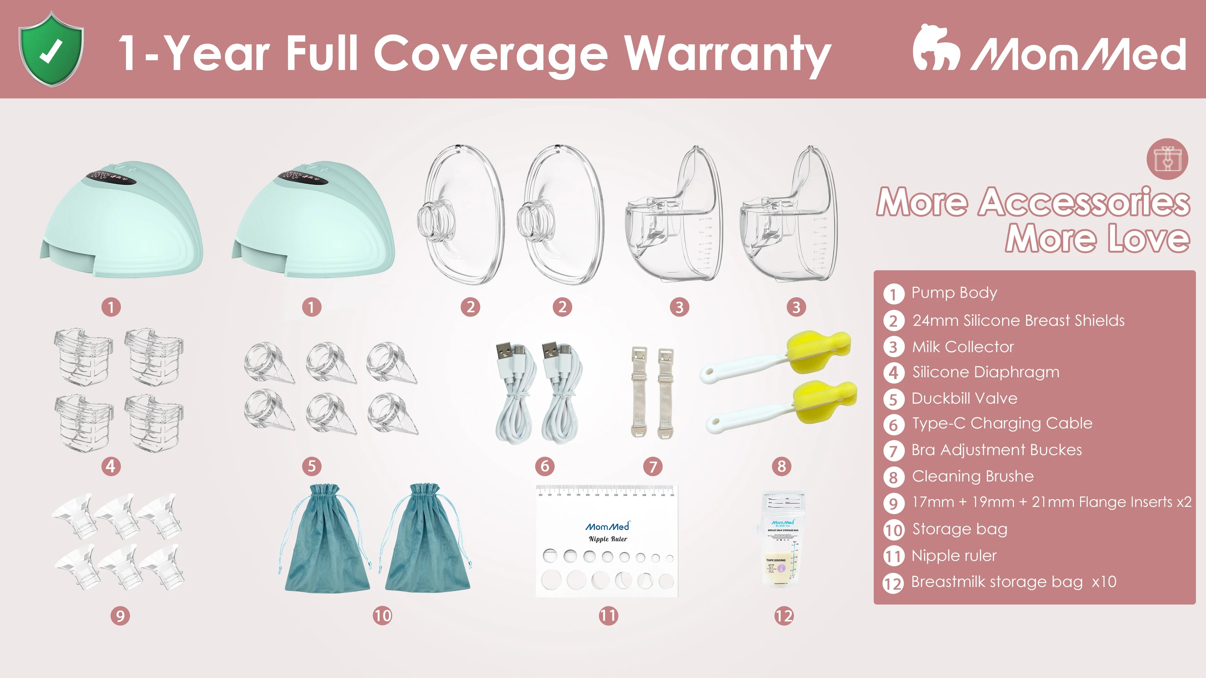 The MomMed S21 breast pump comes with a built-in rechargeable battery that lasts up to 5–6 pumping sessions per full charge. Use the included USB charging cable and allow approximately 2 hours for a full charge. Always charge before first use.