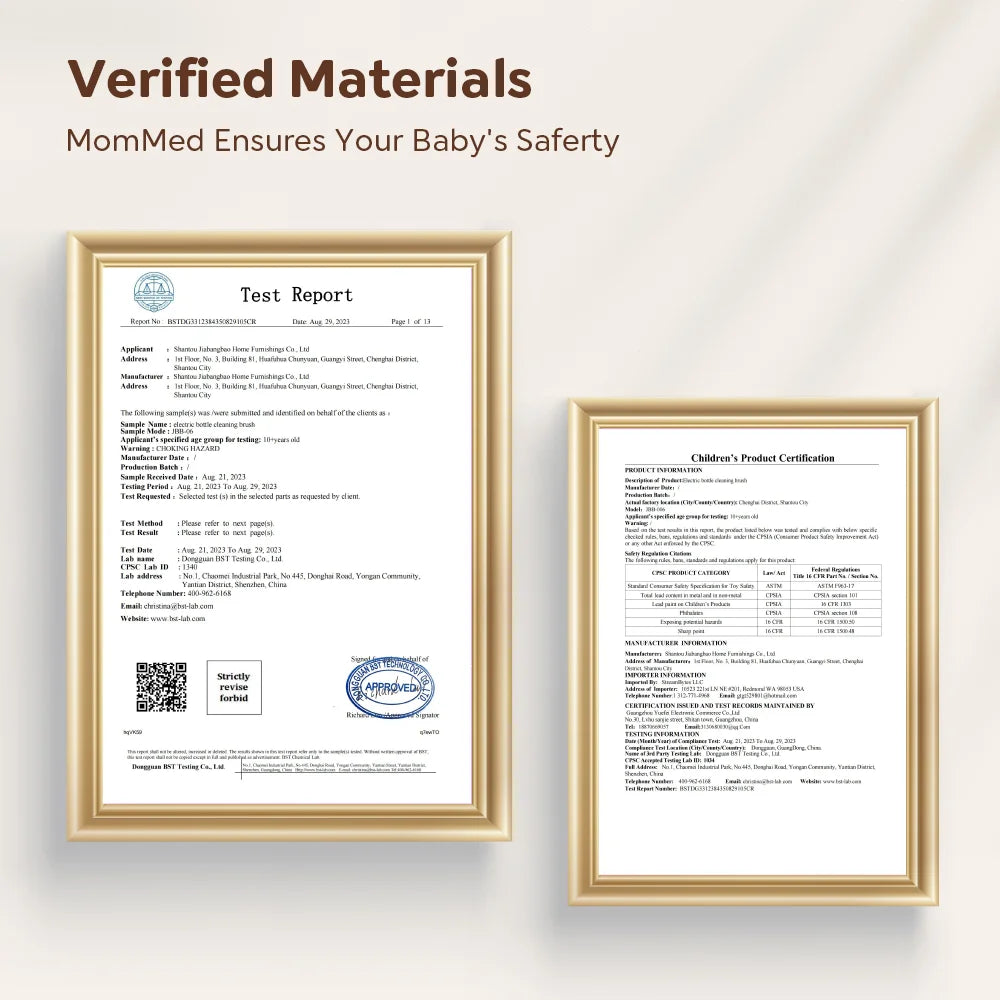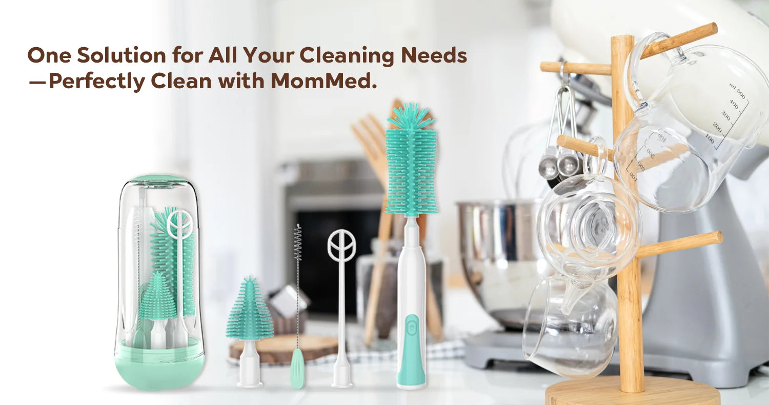 The MomMed Electric Bottle Brush Cleaner Set is designed to fit most standard and wide-neck baby bottles, including glass, plastic, and silicone bottles. Its flexible brush head adjusts easily to various bottle shapes for a thorough clean every time.